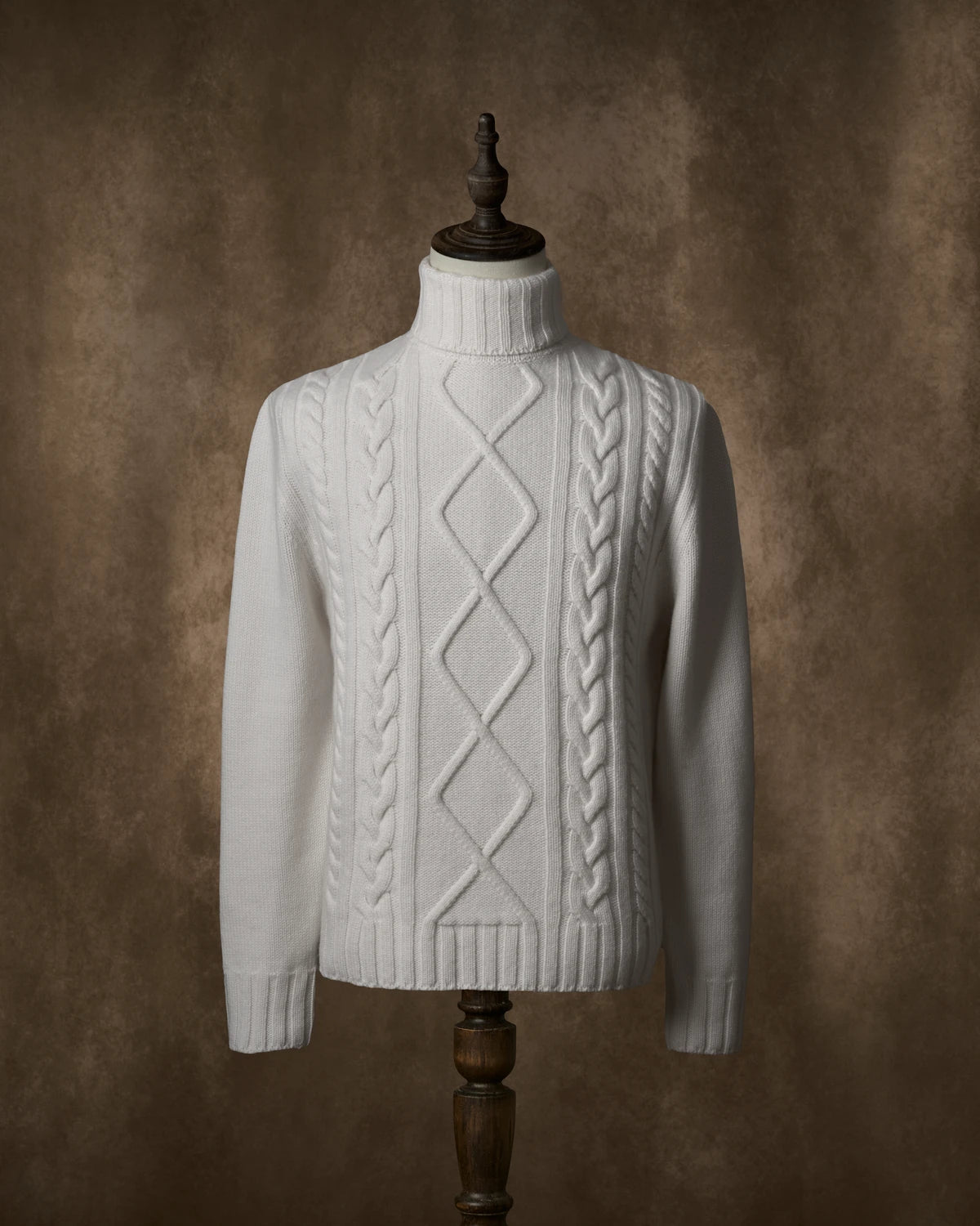 The Cashmere Cable Knit is crafted in a 5-gauge knit with a rare 10-ply construction, an exceptionally heavy use of yarn, to create a garment with richness and an elegant drape.