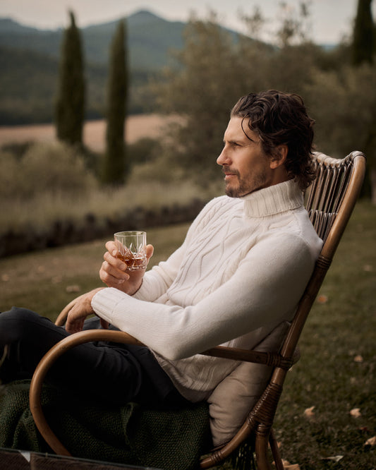 The Cashmere Cable Knit is crafted in a 5-gauge knit with a rare 10-ply construction, an exceptionally heavy use of yarn, to create a garment with richness and an elegant drape.